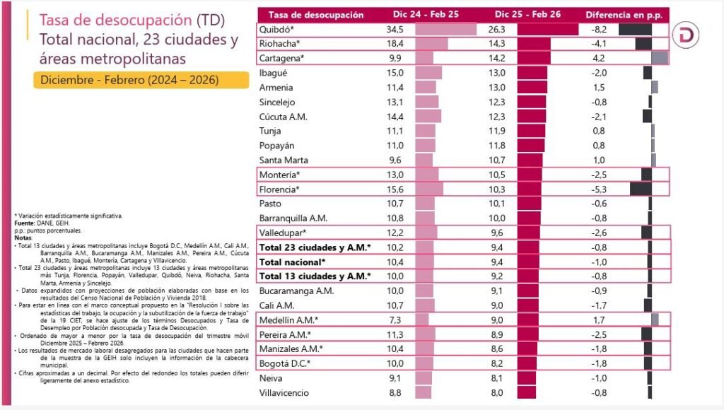 En consecuencia, la ciudad logró una disminución de 2,5 puntos porcentuales frente al mismo periodo del año anterior, lo que evidencia una mejora sostenida en el mercado laboral.